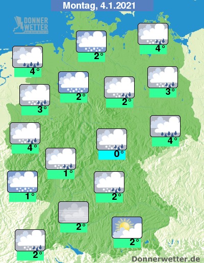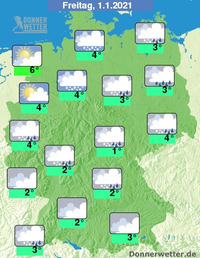 Am Neujahrstag fällt zunächst gebietsweise Regen oder Schneeregen, oberhalb etwa 200 bis 400 Meter meistens Schnee mit Glättegefahr. Im Tagesverlauf werden die Niederschläge seltener. Im Münsterland und an der Ems gibt es kurze freundliche Phasen.