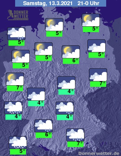 Am Samstagabend liegen die Hauptregengebiete vor allem noch im südlichen Deutschland, in mittleren und höheren Lagen können die Niederschläge hier später auch in Schneeregen oder Schnee übergehen. Bis Mittenacht lockern die Wolken im Norden und Nordwesten zunehmend auf, in den übrigen Landesteilen bleibt die Wolkendecke zumeist geschlossen.