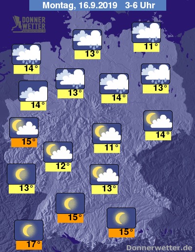 In der Nacht zum Montag ziehen im Norden dichte Wolken durch, die hier zeitweise auch Regen bringen. Im Süden ist es meist sternenklar, über der breiten Mitte Deutschlands meist leicht bis aufgelockert bewölkt, dazu bleibt es hier trocken. Die Temperatur sinkt auf 17 Grad im Breisgau und bis 11 Grad an der Müritz.