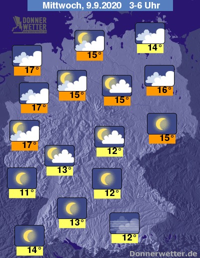 Während der zweiten Nachthälfte verdichtet sich im Norden die Wolkendecke wieder von der Nordsee und den Niederlanden her, nennenswerter Regen fällt jedoch nicht. Im Süden leuchten verbreitet Mond und Sterne. In Südbayern kann sich insbesondere an Gewässern stellenweise Nebel bilden.