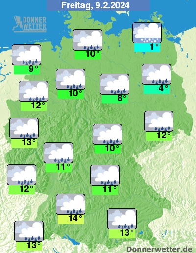 Am Freitag zeigt sich der Himmel meist stark bewölkt oder es ist bedeckt, dabei muss verbreitet mit Niederschlägen gerechnet werden, die anfangs im äußersten Nordosten auch noch als Schneeregen oder Schnee fallen können.