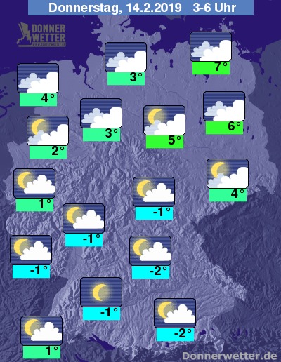 In der Nordhälfte bleibt es mit 1 bis 7 Grad recht mild, während es in der Südhälfte häufig leichten Frost und Reif gibt.