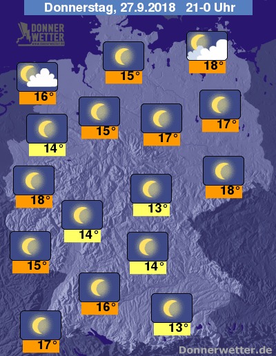 Während der zweiten Nachthälfte werden die Wolken bis zu den nördlichen Mittelgebirgen allmählich etwas dichter, Regen fällt aber nur vereinzelt etwas. Sonst funkeln weiterhin Mond und Sterne. An Gewässern können sich stellenweise Nebelfelder bilden. Im Vergleich zu den letzten Nächten bleibt es aber mit Werten von 8 bis 13 Grad allgemein recht mild. Bodenfröste treten kaum noch auf.