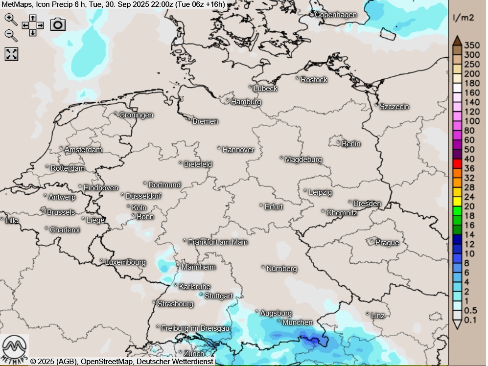 Die Lufttemperaturen für Dienstagnachmittag (16.00 Uhr) sowie die Sechs-Stunden-Regenmengen bis 22:00 Uhr nach Icon: