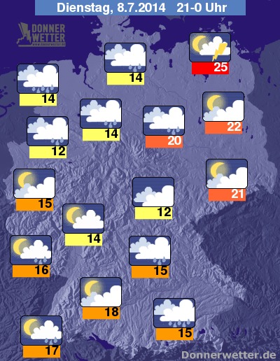 Am Abend bilden sich im Norden und Osten weitere Schauer und Gewitter, sonst ist es ebenfalls meist stark bewölkt und es fällt zeitweise Regen. Freundlicher und meist trocken ist es im Südwesten, hier lockert die Bewölkung meist auf und es bleibt überwiegend trocken. Die Abendwerte liegen bei schwülwarmen 25 Grad in Neubrandenburg und kühlen 12 Grad am Niederrhein.