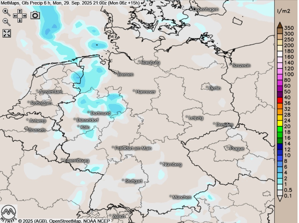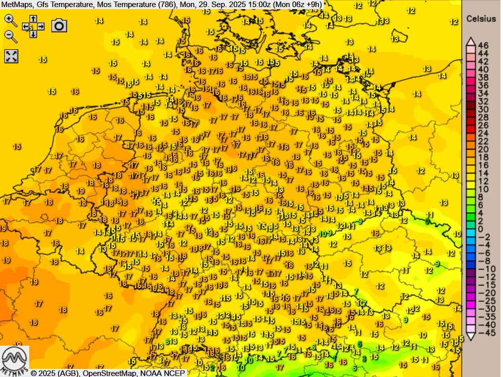Die Lufttemperaturen am Montagnachmittag (15:00 Uhr) sowie die Sechs-Stunden-Regenmengen bis 21:00 Uhr nach GFS: