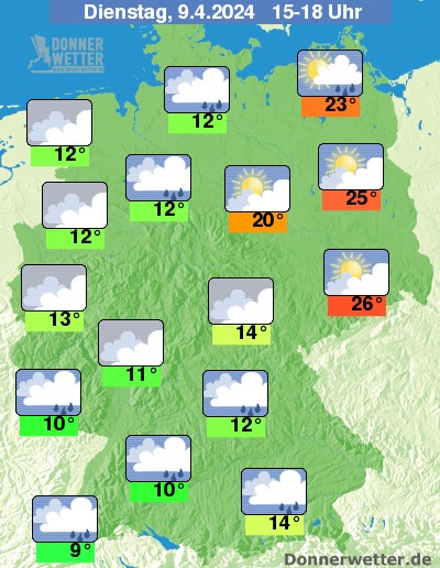 Die Temperaturgegensätze am Nachmittag sind sehr hoch: Am Oberrhein werden nur Werte um 9 Grad erreicht, um 12 Grad im Nordwesten und nochmals sommerlich-warme 25 bis 26 Grad im Osten und Südosten.