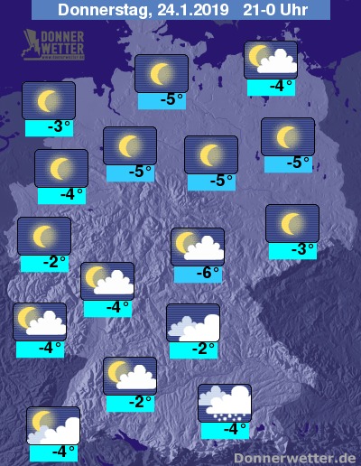 Während der zweiten Nachthälfte muss im Süden regional weiterhin mit leichtem Schneefall, oder Schneegriesel gerechnet werden, wobei die Gefahr von Glätte besteht. Sonst leuchten häufig Mond und Sterne. Nur stellenweise halten sich tiefhängende Wolken oder Nebel.