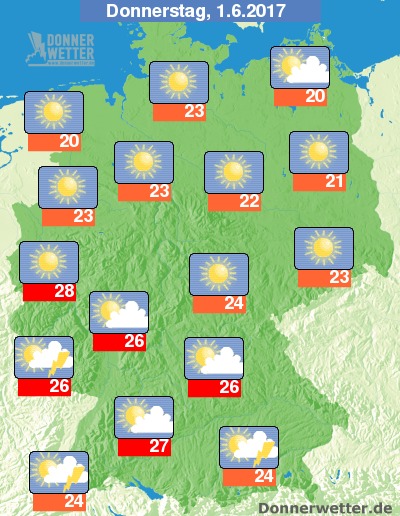 Im Südschwarzwald, sowie im Alpenvorland können sich in schwül-warmer Luft örtliche teils gewittrige Regengüsse entwickeln, die sich bis zum Abend eventuell noch ein wenig nach Norden ausdehnen können. Sonst ist es oft freundlich mit reichlich Sonnenschein und trocken. Bei einem meist schwachen Wind erreichen die Höchsttemperaturen wieder sommerliche 22 bis 29 Grad. Lediglich im Küstenbereich, auf den Inseln und in den Bergen bleibt es mit 16 bis 21 Grad kühler.