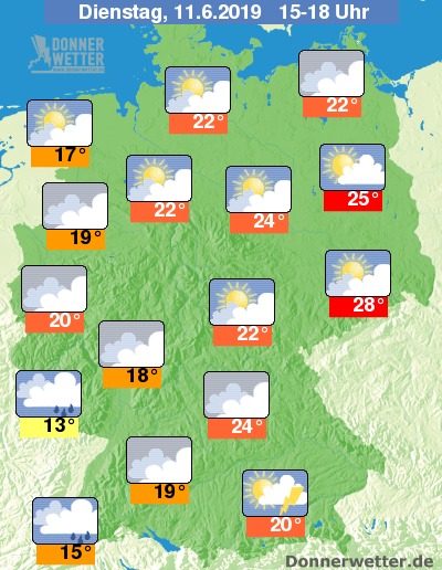 Am späten Nachmittag gibt es im Norden und Osten noch größere Aufheiterungen und Gewitterschauer treten zunächst nur vereinzelt in der Osthälfte auf. Im Laufe des Abends werden diese hier jedoch zahlreicher und können dann örtlich sehr kräftig und in Verbindung mit Platzregen, Hagelschlag und stürmischen Böen ausfallen. Sonst werden die Regenfälle im Südwesten im Tagesverlauf insgesamt seltener. Die Wolkendecke bleibt aber meistens geschlossen.