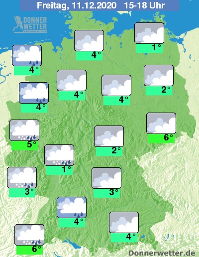 Bis zum frühen Abend breitet sich der Niederschlag bis ins Rhein-Main-Gebiet und nach Schwaben aus und fällt zunächst zum Teil als Schneeregen, in höheren Lagen auch als Schnee mit Glättegefahr. Auch an Niederrhein und Ems kann es nass werden, hier jedoch meist ausschließlich in Form von Tropfen. Sonst bleibt es bei dem ruhigen, trockenen, aber meist trüben Frühwinterwetter.