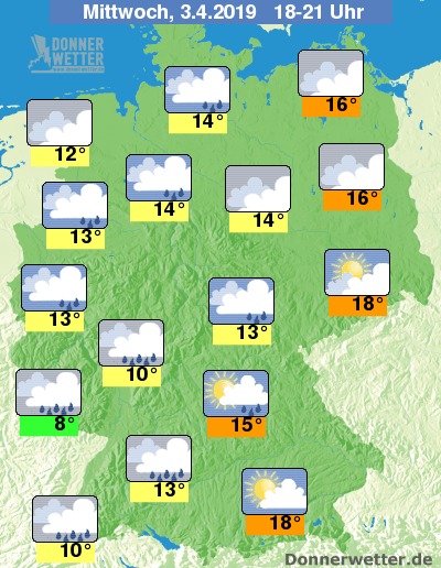 Die Temperaturen bewegen sich zu Dämmerungsbeginn zwischen 8 und 15 Grad, am kühlsten bleibt es dabei im Südwesten. Ganz im Osten werden meist noch zwischen 15 und 18 Grad erreicht.