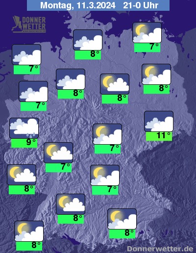 Die Temperaturen gehen in den frühen Morgenstunden zurück auf Werte um 8 Grad in der Kölner Bucht und 2 Grad im Thüringer Becken.