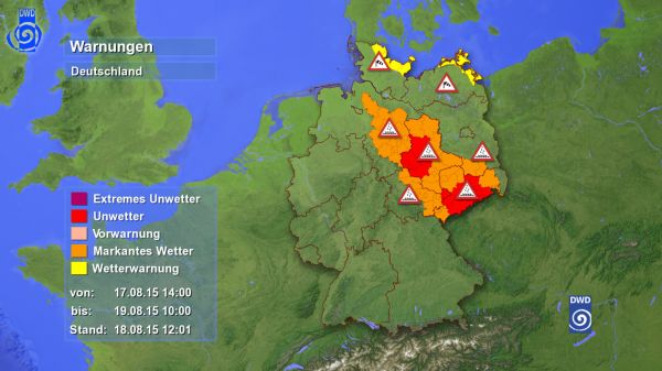 Am Abend ziehen die Regenwolken weiter Richtung Osten. Betroffen sind die Regionen Sachsen-Anhalt, Thüringen, Sachsen und der Harz in Niedersachsen. Im Süden Deutschlands wird der Himmel von Wolken bedeckt, teils zeigt sich auch die Sonne, besonders am Main entlang, im Saarland und am Schwarzwald. Vom Westen aus ziehen graue Wolken bis hin nach Thüringen.