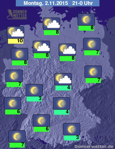 In der Nacht zum Dienstag ziehen nach Nordosten hin noch meist lockere Wolkenfelder durch, im großen Rest des Landes zeigt sich dagegen ein weitgehend sternenklarer Nachthimmel. Hier und da kann sich jedoch Nebel oder Hochnebel bilden. Die Temperatur sinkt auf 8 Grad in Emden und bis 1 Grad am Taunus.