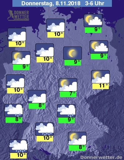 Während der zweiten Nachthälfte regnet es vom Breisgau bis nach Franken gelegentlich, sonst zeigt sich der Himmel teils bewölkt, teils klar. Stellenweise breiten sich Nebelfelder aus.
