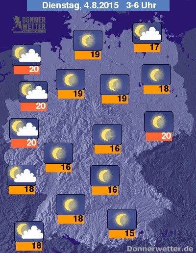 In der kommenden Nacht sind im Ostseeumfeld sowie in den westlichsten Landesteilen oft einige Wolken möglich, sonst zeigt sich der Nachthimmel dagegen weitgehend sternenklar. Es bleibt landesweit trocken bei Tiefstwerten zwischen tropisch warmen 20 Grad entlang der niederländischen Grenze und um 15 Grad im Ciemgau.