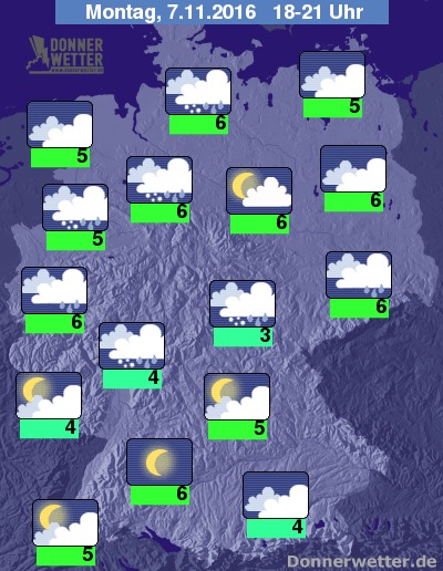Heute Abend zeigt sich der Himmel über dem Süden häufig aufgelockert oder auch sternenklar, hier bleibt es weitgehend trocken. In den weiter nördlich gelegenden Landesteilen bleibt es hingegen verbreitet stark bewölkt und gebietsweise fällt auch Regen, Schneeregen oder Schnee. Dabei ist weiterhin Glätte durch Schnee oder überfrierende Nässe möglich! Die Temperatur liegt bei 3 bis 6 Grad.