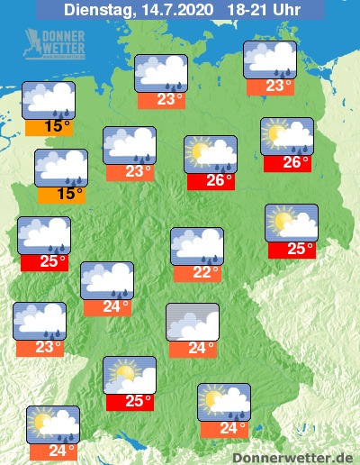 Am Abend muss in der Nordwesthälfte gebietsweise mit Regenfällen oder örtlichen Schauern und einzelnen Gewittern gerechnet werden. In der Südosthälfte bleiben Regengüsse die Ausnahme und neben teils dichteren Wolkenfeldern spendet die allmählich untergehende Sonne noch Helligkeit und wohltuende Wärme.