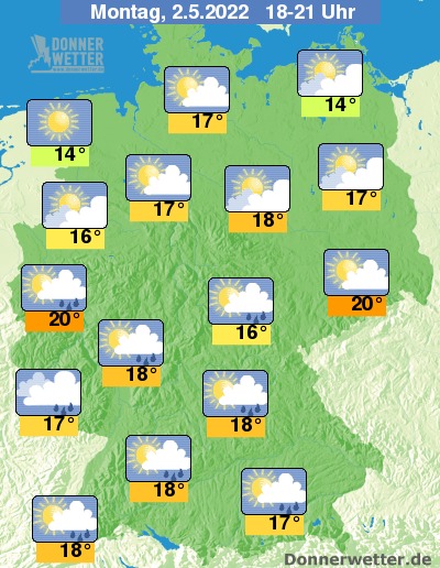 Heute Abend zeigen sich auch über der Südhälfte Deutschlands mehr und mehr Aufheiterungen, jedoch können sich bei regional dichten Wolken noch einzelne Schauer, selten auch Gewitter bilden. Weiter nach Norden hin ist es größtenteils heiter oder wechselnd bewölkt und dabei trocken. Die Temperatur liegt bei 14 Grad an der See und 20 Grad in der Lausitz.
