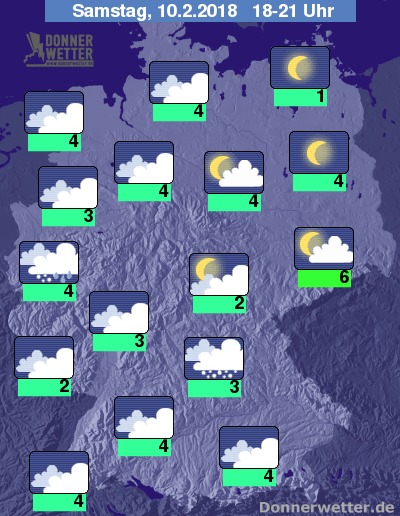 Heute Abend ist es im Osten und Nordosten noch meist locker bewölkt oder klar, sonst halten sich dagegen bereits dichte Wolken, dabei fällt im Süden und Westen hier und da etwas Schnee oder Schneeregen, zumeist ist es aber trocken. Die Temperatur liegt bei 1 bis 6 Grad.