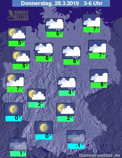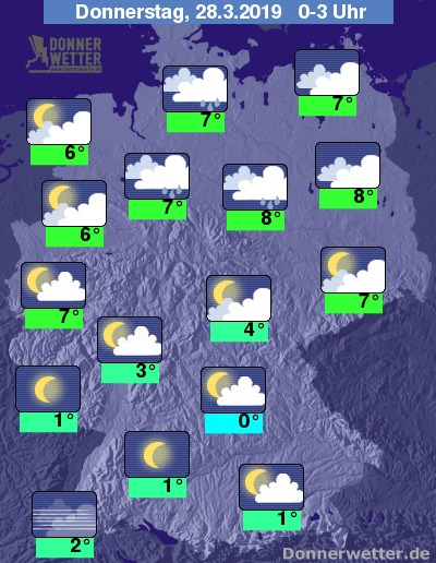 In den Nachtstunden zeigt sich der Himmel nördlich und östlich des Harz überwiegend bedeckt, dabei fallen immer wieder regionale Schauer. In den mittleren Landesteilen bleibt es bei zumeist lockerer Bewölkung häufig trocken, südlich der Donau funkeln die Sterne von einem meist wolkenlosen Himmel. Örtlich kann sich hier Nebel bilden.