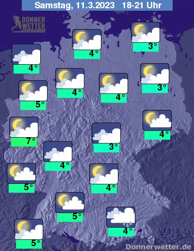Heute Abend ist es im Nordseeumfeld und im Alpenvorland oft bedeckt und es fällt hier und da etwas Regen oder Schnee. Im übrigen Land ist es locker bis aufgelockert, teils auch stark bewölkt, aber trocken. Die Temperatur liegt bei 3 Grad in Erfurt und bis 7 Grad in Köln
