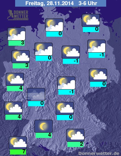 In der kommenden Nacht ist es verbreitet locker oder aufgelockert bewölkt, im Süden wird es gebietsweise auch sternenklar, dazu bleibt es trocken. Stellenweise bildet sich Nebel oder Hochnebel. Die Temperatur sinkt bis zum Morgen auf recht milde 7 Grad in Freiburg und auf kalte -1 Grad im Raum Berlin-Brandenburg.