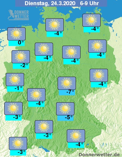 Die Temperaturen sinken, ausgenommen die Nordseeküste, meist überall in den Frostbereich; die Tiefstwerte liegen dann bei 0 Grad in der Kölner Bucht und um -7 Grad in Franken. Auf den Gipfeln der Mittelgebirge sowie in den Alpen fällt das Thermometer auch auf Werte um -10 Grad.