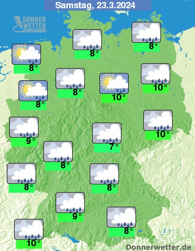 Am Samstag zeigt sich der Himmel meist stark bewölkt oder es ist bedeckt, dabei muss von Nordwesten her im Tagesverlauf immer wieder mit Schauern gerechnet werden; lokal sind auch kurze Graupelgewitter möglich. In den höheren Lagen fallen die Niederschläge als Schnee.