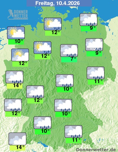 Am Freitag ziehen überwiegend viele und auch kompakte Wolken durch. Entlang einer Kaltfront, die im Tagesverlauf von West nach Ost über Deutschland hinwegzieht fällt auch zeitweise Regen. In höheren Lagen der östlichen und südöstlichen Mittelgebirge fällt zum Teil Schnee. Die Temperatur erreicht 7 Grad in der Magdeburger Börde und bis 14 Grad entlang des Rheins.