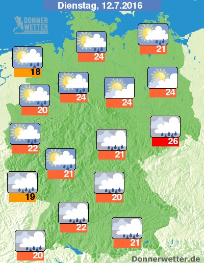 Am Dienstag zeigt sich der Himmel teils aufgelockert, häufig jedoch auch stark bewölkt, dabei sind bevorzugt nachmittags verbreitet Schauer und auch örtliche Gewitter möglich. Im Osten bleibt es jedoch überwiegend trocken. Die Temperatur steigt auf 18 Grad an der Nordseeküste und bis 26 Grad in Dresden.