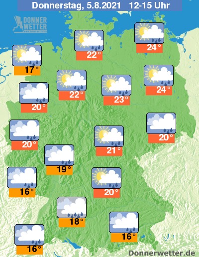 Heute Nachmittag zeigen sich hier und da Auflockerungen oder heitere Abschnitte, häufig ziehen aber dichte Wolken durch, dabei bilden sich gebietsweise Schauer, vereinzelt entwickeln sich zudem auch Gewitter. Die Temperatur steigt auf teils nur 16 Grad im Saargau und bis 24 Grad in Berlin.