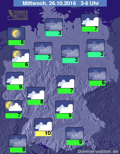 In der kommenden Nacht bleibt es über der Südhälfte Deutschlands überwiegend stark bewölkt, wobei nur am Alpenrand hier und da Regen fällt. Weiter nach Norden hin zeigt sich der Himmel oft sternenklar, gebietsweise, vor allem im Ostseeumfeld ist es auch stark bewölkt, dabei bleibt es aber trocken. Es bildet sich stellenweise Nebel oder Hochnebel. Die Temperatur sinkt auf 10 Grad in Stuttgart und bis 3 Grad an der Elbe.