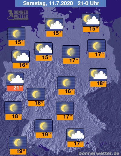 Am späteren Abend klart der Himmel über weiten Teilen Süddeutschlands sowie über der Mitte auf, einzelne Schauer fallen noch am Alpenrand. Im norddeutschen Tiefland sowie im Westen ist es meist locker bewölkt, es bleibt aber trocken.