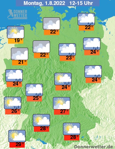 Heute Nachmittag scheint an den Alpen häufig die Sonne und es ist trocken. Im übrigen Land ist es dagegen mehrheitlich stark, dazwischen aber auch gebietsweise aufgelockert bewölkt. Im Norden und Nordwesten bleibt es dazu trocken, sonst können sich jedoch einzelne Schauer bilden. Die Temperatur liegt bei 19 Grad an der Nordsee und 29 Grad im Oberrheingraben.