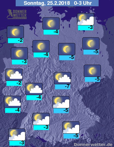 In der zweiten Nachthälfte zeigt sich der Himmel über dem Norden und Osten meist sternenklar, im Ostseeumfeld gibt es auch mal ein paar Wolken. Im Südteil Deutschlands ist der Himmel teils locker, teils aufgelockert bewölkt und es bleibt trocken.