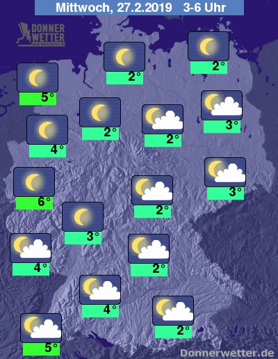 Die Wochenmitte startet in der gesamte Nord- und Westhälfte mit viel Sonnenschein, im Süden und Südosten ist es zumeist locker bewölklt. Es bleibt trocken bei Werten um 1 bis 6 Grad C.