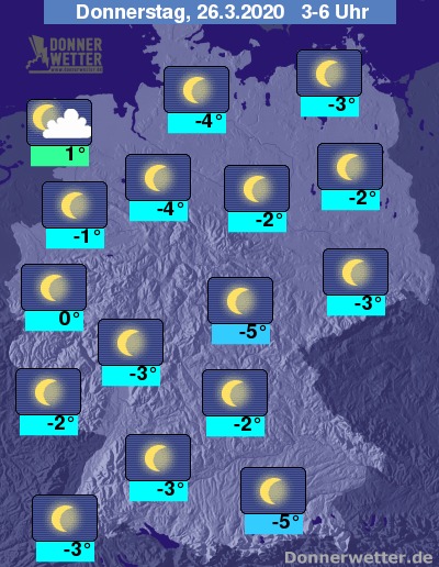 Bis zu den Frühstunden wird es wieder sehr kalt. Die Luft kühlt verbreitet in den leichten Frostbereich ab. In geschützten Tälern droht sogar wieder mäßiger Frost mit Werten von unter -5 Grad. Frostfrei bleibt es nur direkt auf der Nordsee, sowie auf den Inseln.