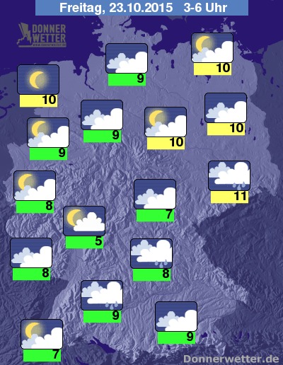 In der Nacht zum Freitag fällt unter dichten Wolken im Süden und Osten der Republik zeitweise etwas Regen, weiter nach Nordwesten hin ist es zum Teil aufgelockert, teils aber auch stark bewölkt und dazu jedoch weitgehend trocken. Im Nordseeumfeld zeigt sich der Himmel auch verbreitet sternenklar. Die Tiefstwerte liegen bei 11 Grad in Dresden und 5 Grad am Taunus.