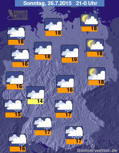 In der Nacht zum Montag bleibt es im Nordosten und teils im Norden der Republik weitgehend trocken bei jedoch überwiegend starker, teils auch aufgelockerter Bewölkung. Im übrigen Bundesgebiet ziehen hingegen dichte Wolken durch und es fällt immer wieder Regen. Im Süden bilden sich häufig Schauer und auch einzelne Gewitter. Die Temperatur sinkt auf 16 Grad in Freiburg und etwa 11 Grad im Eichsfeld.