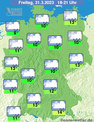 Heute Abend bleibt es bedeckt, im Süden bilden sich noch gebietsweise Schauer, im übrigen Bundesgebiet fällt zeitweise Regen. Die Temperatur liegt bei 9 Grad in Wilhelmshaven und 14 Grad im Raum München.
