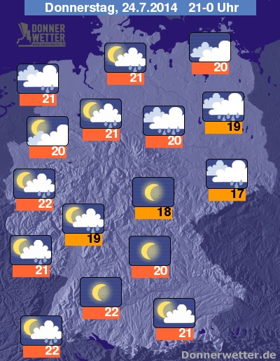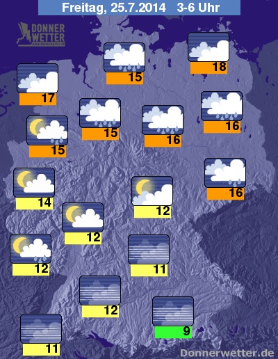 In der Nacht zum Freitag ziehen die dichten Wolken mit teils ergiebigem Regen weiter nach Norddeutschland. In Süden und Westen Deutschlands ist es häufig klar oder aufgelockert bewölkt, dabei können sich vor allem von Rheinland-Pfalz bis zum Saarland gebietsweise Schauer und Gewitter bilden, sonst bleibt es weitgehend trocken. Die Temperatur sinkt auf 18 Grad auf Rügen und 9 Grad im Allgäu.