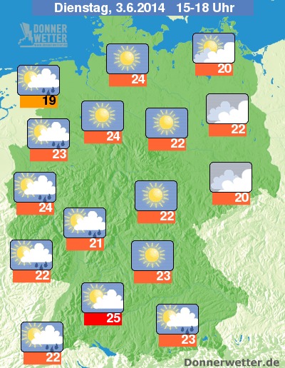 Am Nachmittag und zum Abend hin halten sich im Osten oft dichte Wolken, aber hier ist es meist trocken. Nach Süden und Westen ist mit teil kräftigen Schauern und Gewittern zu rechnen. Sonst ist es besonders von der Mitte bis in den Norden verbreitet heiter und trocken. Die Temperaturen liegen bei 18 bis 23 Grad.