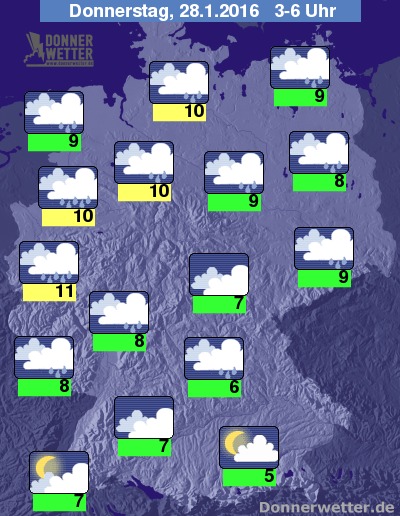 In der Nacht zum Donnerstag breiten sich die dichten Wolken und der teils kräftige Regen noch weiter nach Süden und Osten hin aus, bis zum Morgen bleibt es nur im Süden noch weitgehend trocken und dabei auch noch oft aufgelockert, teils jedoch auch stark bewölkt. In den übrigen Landesteilen bleibt es bedeckt und es fällt immer wieder, zum Teil kräftiger Regen. Die Temperatur sinkt auf 11 Grad in Köln und bis 5 Grad in München. Es weht verbreitet frischer und teils starker Wind.
