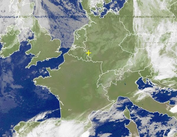 Das aktuelle Satellitenbild zeigt Schauerbewölkung über Deutschland. Von der Nordsee her ist kühle Luft eingeflossen. Es ist die Vorbereitung des kühlen Abends.