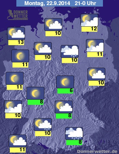 Heute Abend fällt vor allem im Südosten und gebietsweise im Osten des Landes noch weiterer Regen, sonst lockert die Bewölkung aber verbreitet auf und vor allem vom Westen bis in die Mitte wird es häufig sternenklar, dazu bleibt es trocken. Die Abendtemperatur liegt bei 13 Grad in Emden und sehr frischen 6 Grad im Thüringer Wald.