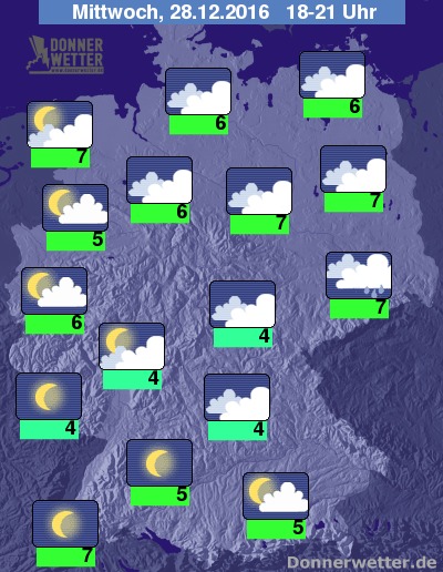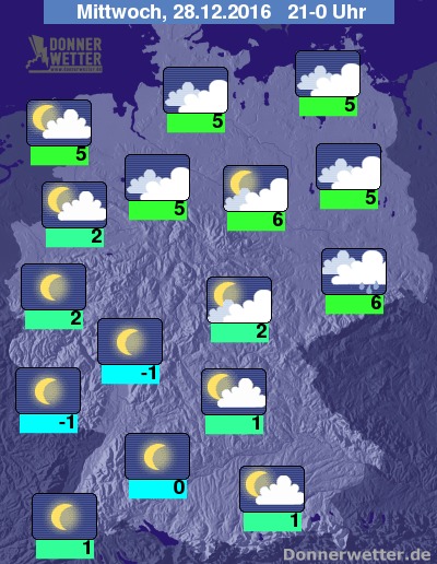 Richtung Mitternacht klart der Himmel in weiten Teilen des Landes auf und es wird kühler. Minus 1 Grad C erreichen wir an der Mosel. Vom Niederrhein bis zum Bodensee ist der Himmel überwiegend klar und im Südosten finden wir nur eine leichte Bewölkung vor. In der Nordhälfte teils bedeckt, teils mäßige Bewölkung und mildere Temperaturen um 6 Grad C entlang der Elbe.