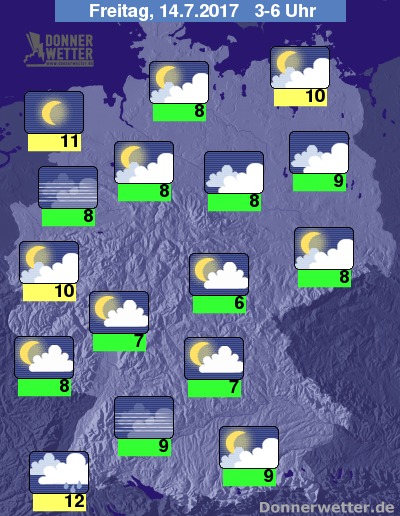 Bis zum Abend kommt die Sonne auch im Norden immer häufiger zum Vorschein. Letzte dichte Wolken halten sich dann nur noch in Nähe der Nordsee. Dabei entsteht ein Temperaturgefälle zwischen Nord und Süd, das bis zum Abend rund 7 Grad beträgt. Die Höchstwerte liegen entsprechend zwischen 16 Grad an der Küste und 23 Grad entlang des Rheins.