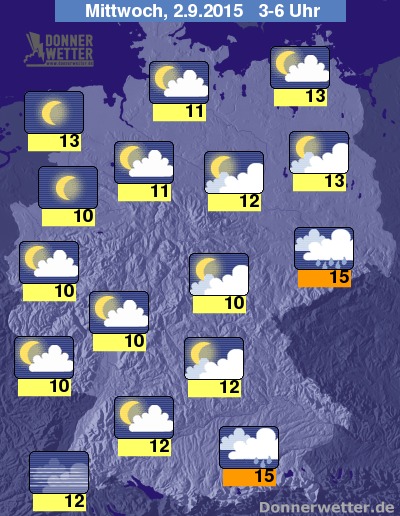 In der folgenden Nacht fällt im Süden und Osten Deutschlands zeitweise weiterer Regen. Er zieht sich bis zum Morgen aber meist ins Voralpenland zurück und im Osten klingt er nach und nach komplett ab. Im Norden und Westen des Landes zeigt sich der Himmel verbreitet sternenklar oder nur locker bewölkt, aber auch in den übrigen Landesteilen ist es zumeist locker bewölkt, gebietsweise aber auch noch aufgelockert bewölkt, dazu jedoch ebenso trocken. Die Temperatur sinkt auf 15 Grad in München und etwa 10 Grad am Niederrhein.